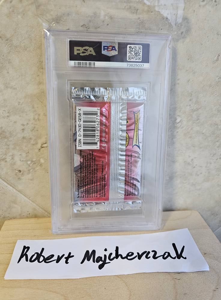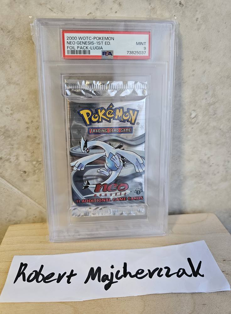 Powyższe pytanie dotyczyło zdjęcia zamieszczonego poniżej. Jest to zdjęcie jednego z grupowiczów (Roberta otagowanego na fotce), który chce sprzedać niemały rarytas, czyli rzadki booster Neo Genesis 1st Edition – Lugia artwork (WOTC 2000) zgradowany przez PSA na 9. I właśnie o ten grading padło pytanie. Postaramy się na nie odpowiedzieć.